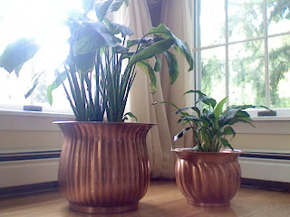 So, it is with cautious optimism that I report on the extraordinary survival of two plants that have been under my care for almost 2 years now. They were sent right after my father died, in November 2006, to be displayed at his wake/funeral. Afterwards, my mother divvied up the plants and tabletop florals my dad received, and even with my murderous track record, she gave me one. It had a green flat leaf plant in the middle, with a bit of ivy surrounding it. Very cute little plants. Much too young to die, really. I accepted them with a heavy heart.