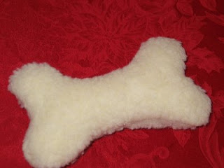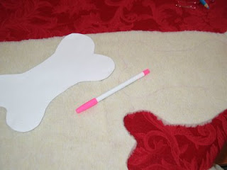 First, she free-handed a bone pattern on a piece of paper. Then, she traced it onto some sheepskin fleece, and cut out two pieces.