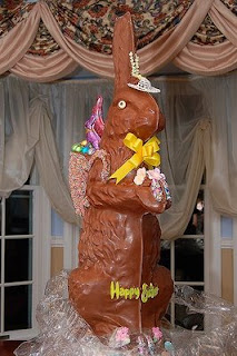 I recently received this massive chocolate bunny (3-feet-tall, 19.4 pounds) from a friend, right in time for Easter. One of my daughters immediately dubbed him “Bubba the Bunny.” We’ll be bringing Bubba to Easter dinner with us, where he will be the star attraction come dessert time.