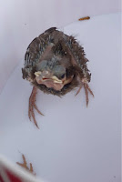 Yesterday afternoon, my daughters called me at work, frantic. One of the baby birds was dead (all that was left on the ground was a wing—a stray cat must have made off with the rest) and another of the babies had jumped out of the nest and was floundering on the ground. I thought at first that it was pushed out, but no, my eldest said she saw the bird jump out of the nest on its own.