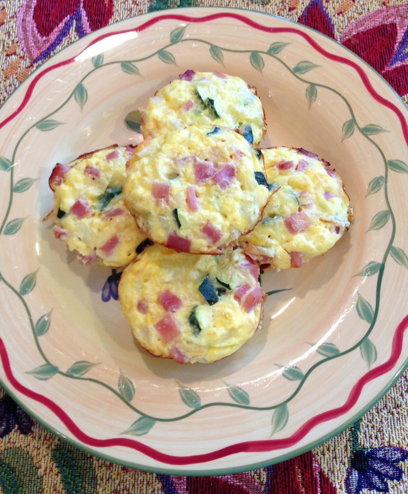 Preheat oven to 350 degrees Farenheit. Spray the muffin tin with Pam and set aside (don’t use paper cupcake liners!). In a small bowl, combine the shredded cheese, ham, zucchini & onion. Spoon the mixture directly into the six muffin cups, dividing evenly (about 2 heaping TBS per muffin). Add 2 TBS of Egg Beaters to each muffin cup, which is just enough to cover the veggie/cheese mixture and bind it all together. Bake for 30 minutes. Allow to cool slightly, then run a butter knife along the edges to loosen the muffins and pop them out onto a wire rack. You can eat them immediately or let them cool completely and refrigerate for later. Makes 12 muffins.