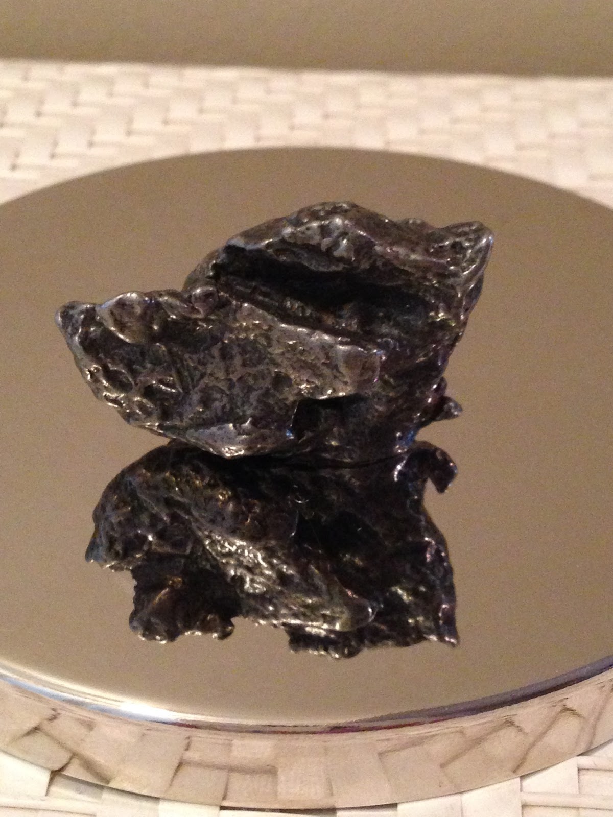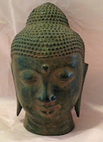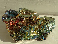 Here are the things I bought today, from top to bottom, right to left: a copper Sakyamuni Buddhi head with a beautiful natural patina; Tingshaws (pairs of hanging cymbals used in Buddhist ceremonies); a piece of the Tunguska meteorite that fell to Earth in Siberia in 1908; a hand-carving of a lizard in a piece of driftwood; a piece of Bismuth crystal, with its unique stair-step pattern and rainbow irridescence; a tiny pig figurine carved out of glittery goldstone; a wooden cross in a whitewash finish.