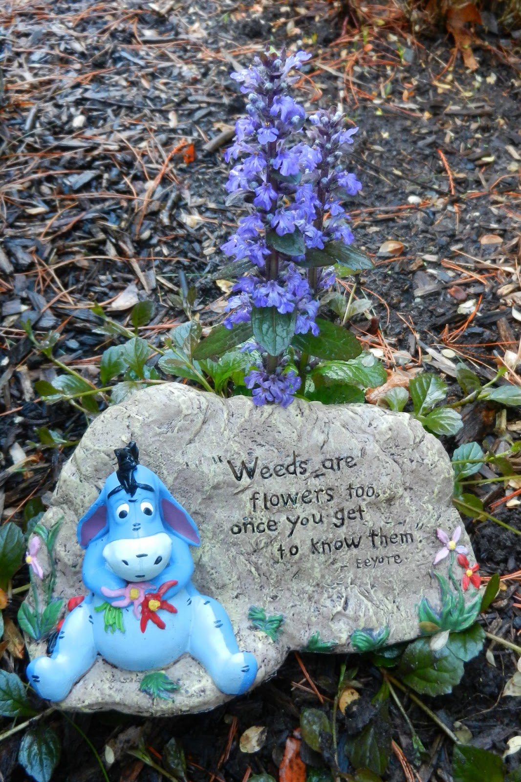 I bought this garden sign a few weeks ago, because I loved its message. It shows sad, misunderstood little Eeyore, making a plea on behalf of the lowly, much-maligned weed: “Weeds are flowers, too,” he says, “once you get to know them.” Unfortunately, I don’t have the greenest of thumbs–okay, I admit it, I tend to kill every plant I touch. But weeds…weeds I can grow just fine! And so, I have an abiding affection for them. Most people hate weeds, and devote hours of time, great sums of money, and gallons of chemicals to get rid of them. Not me. I don’t particularly like the prickly kind (thistle) or the itch-inducing kind (poison ivy), but the flowering ones (like the Creeping Charlie rising up behind Eeyore) are always welcome.