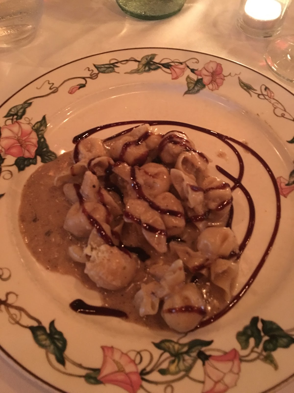I had ordered the pasta special, cheese-filled “pasta pockets” with a gorgonzola cream sauce, and it took a really long time to finally emerge from the kitchen. Once it came, it was such a small amount of pasta–10 small dumplings only slightly larger than standard tortellini–my husband immediately asked if it was actually an appetizer portion. It wasn’t, and the cost: a whopping $30.