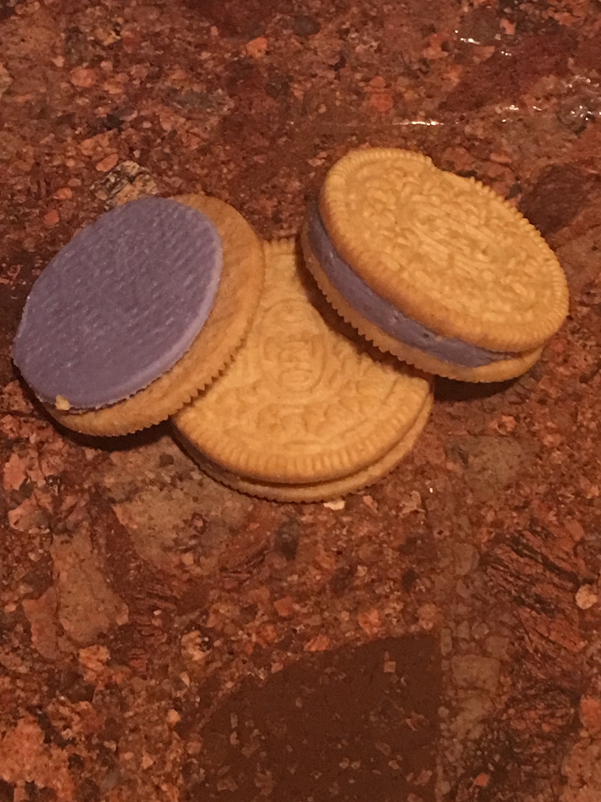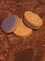 Once again, the sandwich cookie for these are vanilla-based, which really allow the flavored creme filling to shine through. The scent wasn’t overpoweringly blueberry, but pleasant enough. The color, on the other hand–yikes. It looks more like a grayish purple–a color I have yet to see occur naturally in ANY food–which was a little off-putting.