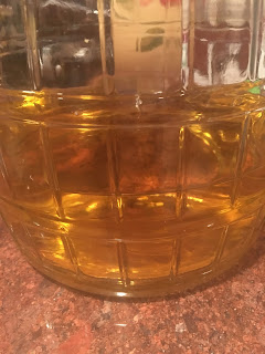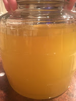 The next step is to make a Simple Sugar Syrup, consisting of 4 cups of white sugar and 6 cups of water. You stir the two together in a pot and then just leave it alone until it comes to a boil. Let it boil for 5 minutes, then cool completely before adding it to the jar of strained liquor. As soon as you stir in the cooled syrup, you start to see the color of the finished product shaping up.