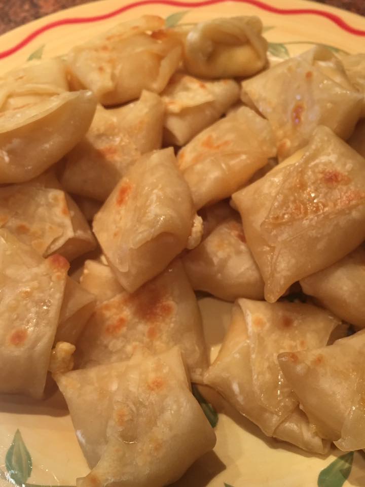 Super easy to make: just combine a container of Philadelphia brand Jalapeño cream cheese with half a cup of shredded Kraft Four Cheese Mexican Cheese and 2 Tablespoons of Ortega Taco sauce. Put a small dollop (about the size of a nickel) in the center of a wonton wrapper. Wet all around the edges of the wrapper with water, then fold one corner over diagonally to form a triangle. Fold the points of the triangle in towards the center, brushing the tips with water to seal them down.