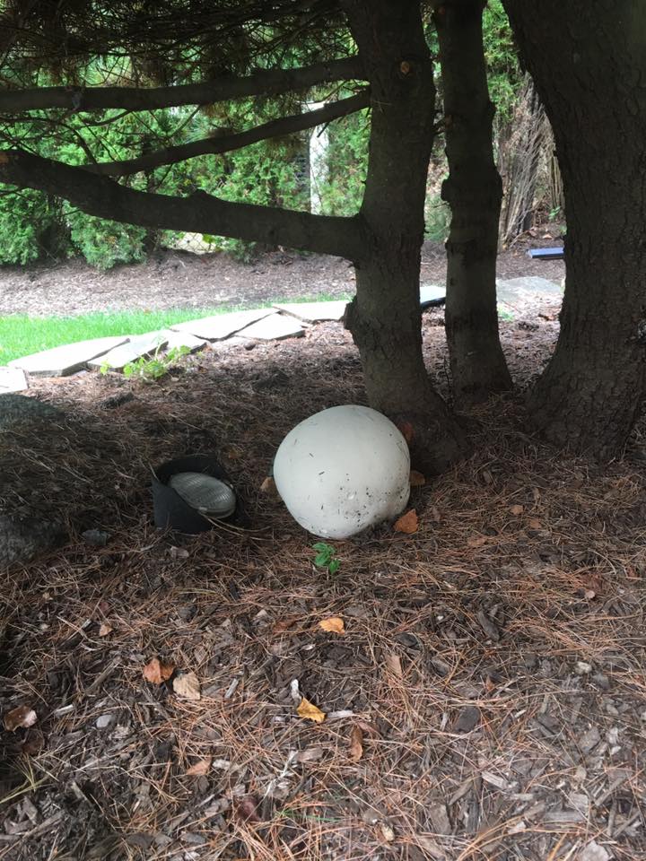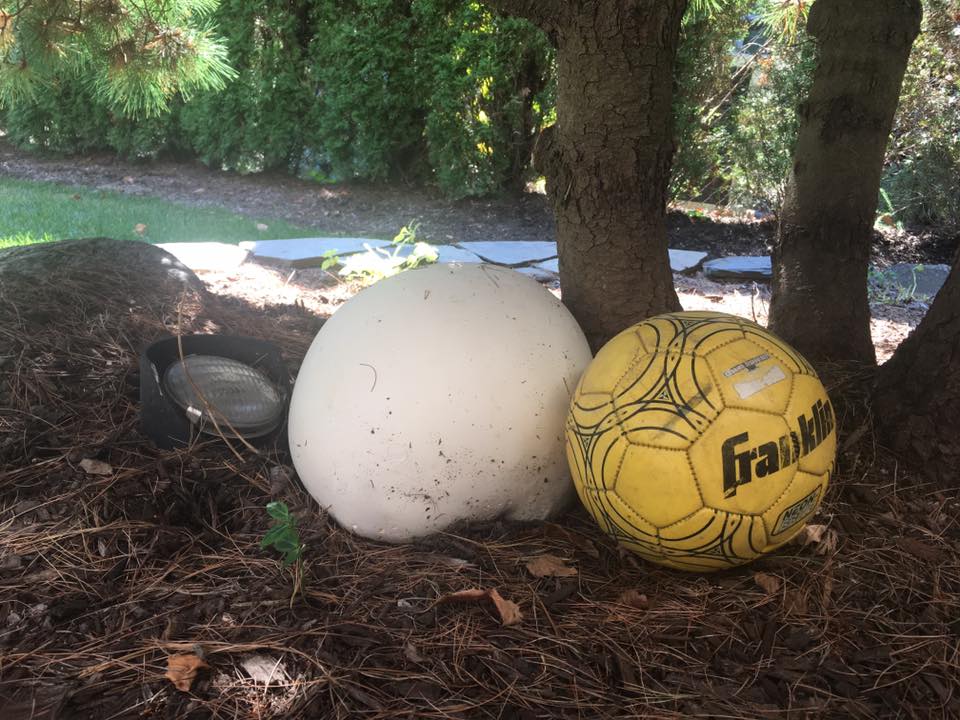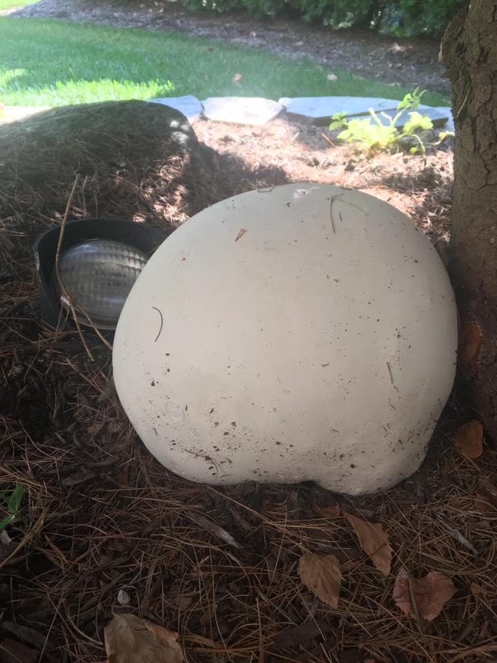 I’m told it’s a “puffball mushroom”. This one seems to love the spotlight–literally! It’s already almost the size of a volleyball, and still growing. I’m going to leave it alone and see just how big it can get.