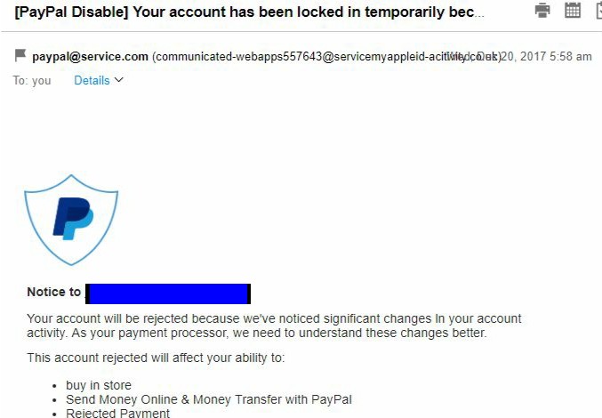 — This one says it’s from “Paypal@service.com” but if you look at the string after it, you can see that the email address has been spoofed.