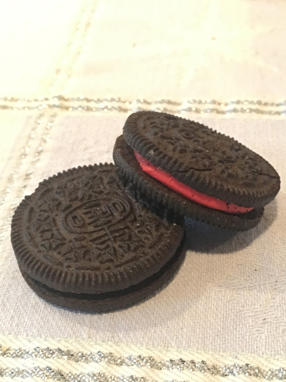 The cinnamon red hot flavoring is almost non-existent, and the chocolate sandwich cookie totally overwhelms it. I tried eating just the filling, and still, you can barely taste the red hot flavoring. You can smell it–faintly–but there’s zero tingle on your taste buds….absolutely nothing like having red hot candies. Bummer.