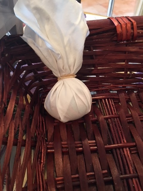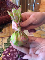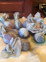 The “how-to” couldn’t be simpler: you wrap raw eggs in squares of pure silk fabric, securing them at the top with a twist tie or rubber band. Try to allow the fabric to lay as flat as possible against the egg, to transfer as much of the pattern as possible. Then wrap the silk bundles in plain cotton squares, securing with another rubber band (I cut up an old bed sheet for this purpose).