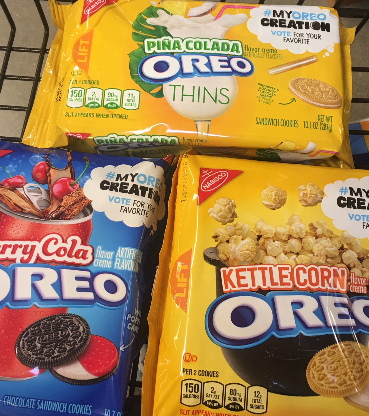 Earlier this morning, a friend tagged me in a post about three new Oreo flavors that were being released: Kettle Korn, Cherry Cola, and Piña Colada. Lo and behold, I found them just a few hours later at my local Wegman’s supermarket.