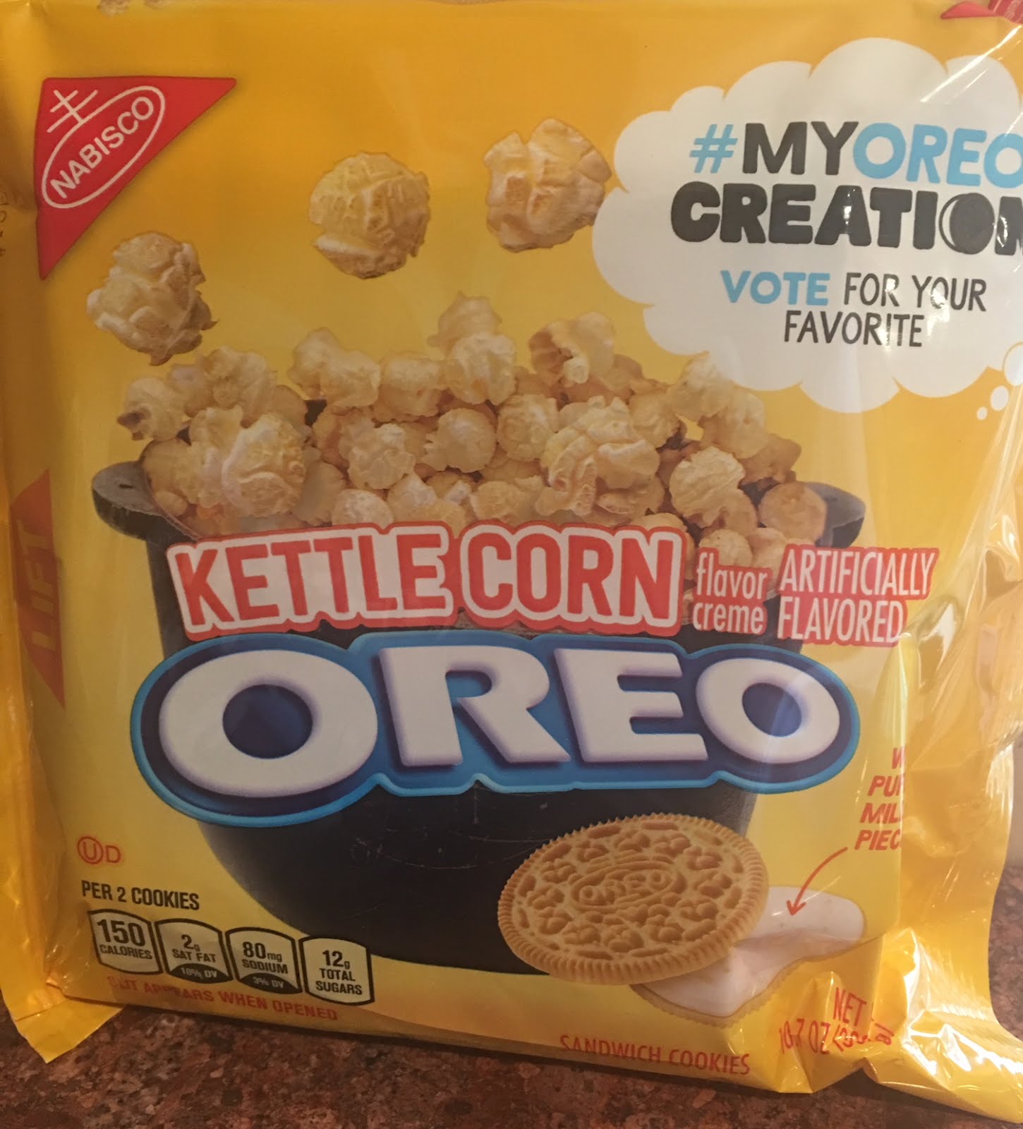 I think someone at Nabisco must be reading my reviews at this point, because the ratio of crème filling to cookie was outstanding–well done to whomever made that call. The crème is the star of the show, imparting a caramel flavor, with just a tiny hint of salted butter–just like real Kettle Korn.