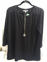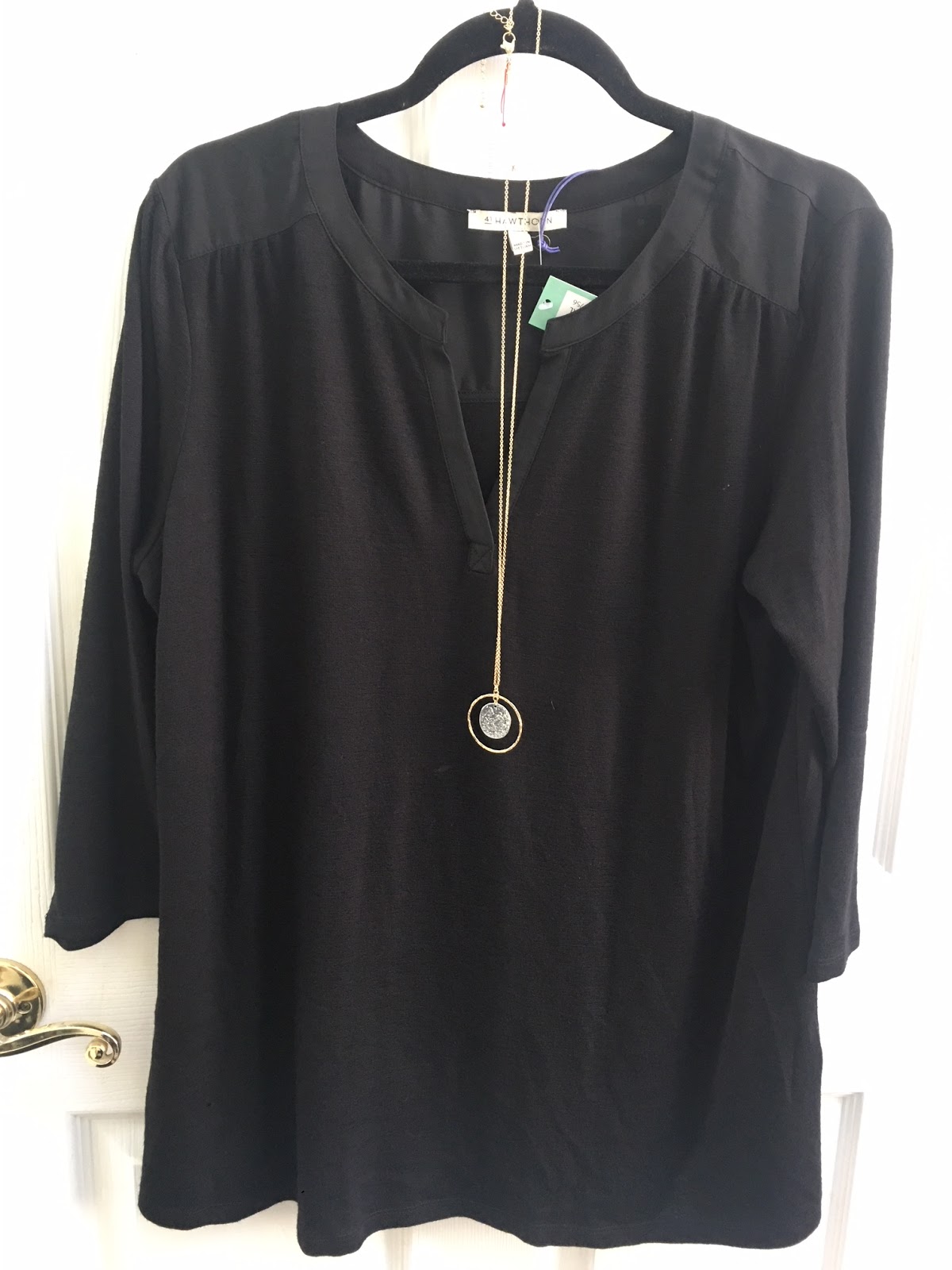 Third clothing item and Jewelry item: Black long-sleeved tunic shirt, $54 and Gold & Silver tone necklace, $28