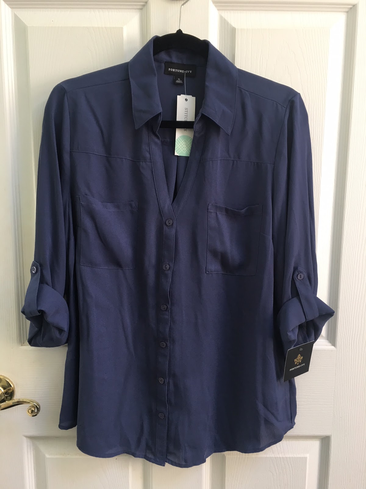 The color on this was my favorite–a smoky dark blue with a cut that was flattering. Two issues, though: the top button pulled slightly in the front, because of the bra I was wearing, and the fabric was a bit sheer. I changed into a “lower profile” bra, but it was white instead of beige and showed through more than the first bra, so I also put on a cami underneath, and it was perfect. Another keeper!