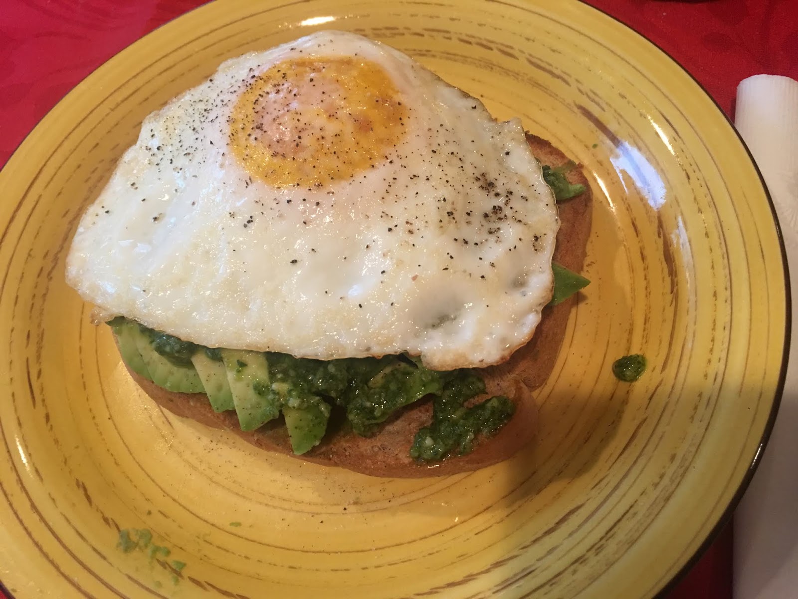 This morning’s version: 647 low carb bread, toasted, with half an avocado sliced up on top. Add salt & pepper, a drizzle of pesto sauce, and top with a fried egg. Good stuff!