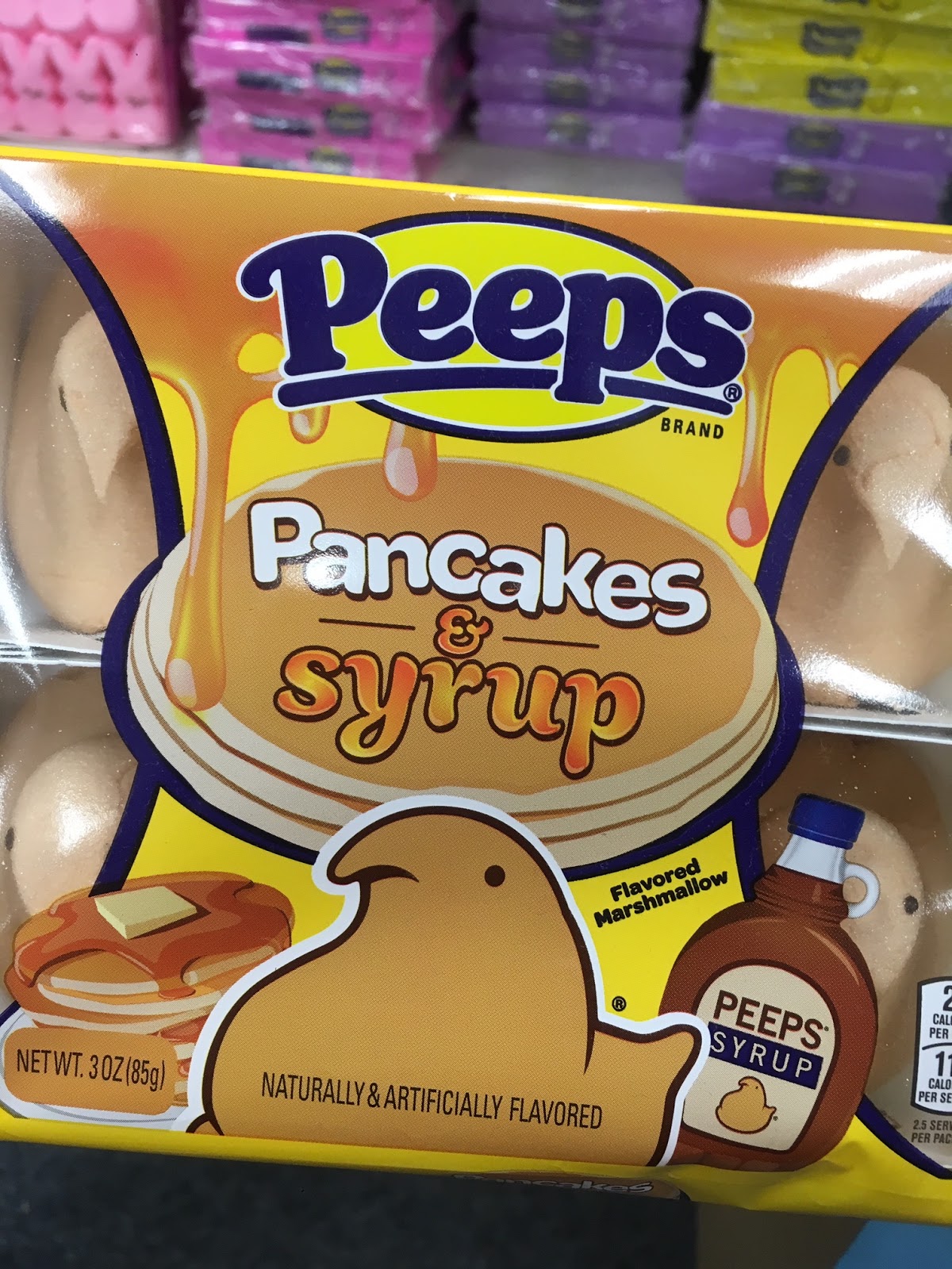 Eventually, the Just Born company started releasing Peeps in a range of colors. From Wikipedia: The yellow chicks were the original form of the candy — hence their name — but then the company introduced other colors and, eventually, the myriad shapes in which they are now produced. Peeps were manufactured in different colors such as lavender and blue starting in 1995. Prior to that they were only being produced in the traditional colors: pink, white, and yellow. New flavors such as vanilla, strawberry, and chocolate were introduced between the years of 1999 and 2002.”I’m sorry to report that things have officially gotten out of hand. In keeping with the relentless onslaught of “Limited Edition” flavors that our tried-and-true favorites have been releasing (yes, Oreos, I’m looking at you), the other day, I stumbled across Party Cake Peeps and Pancakes & Syrup Peeps.